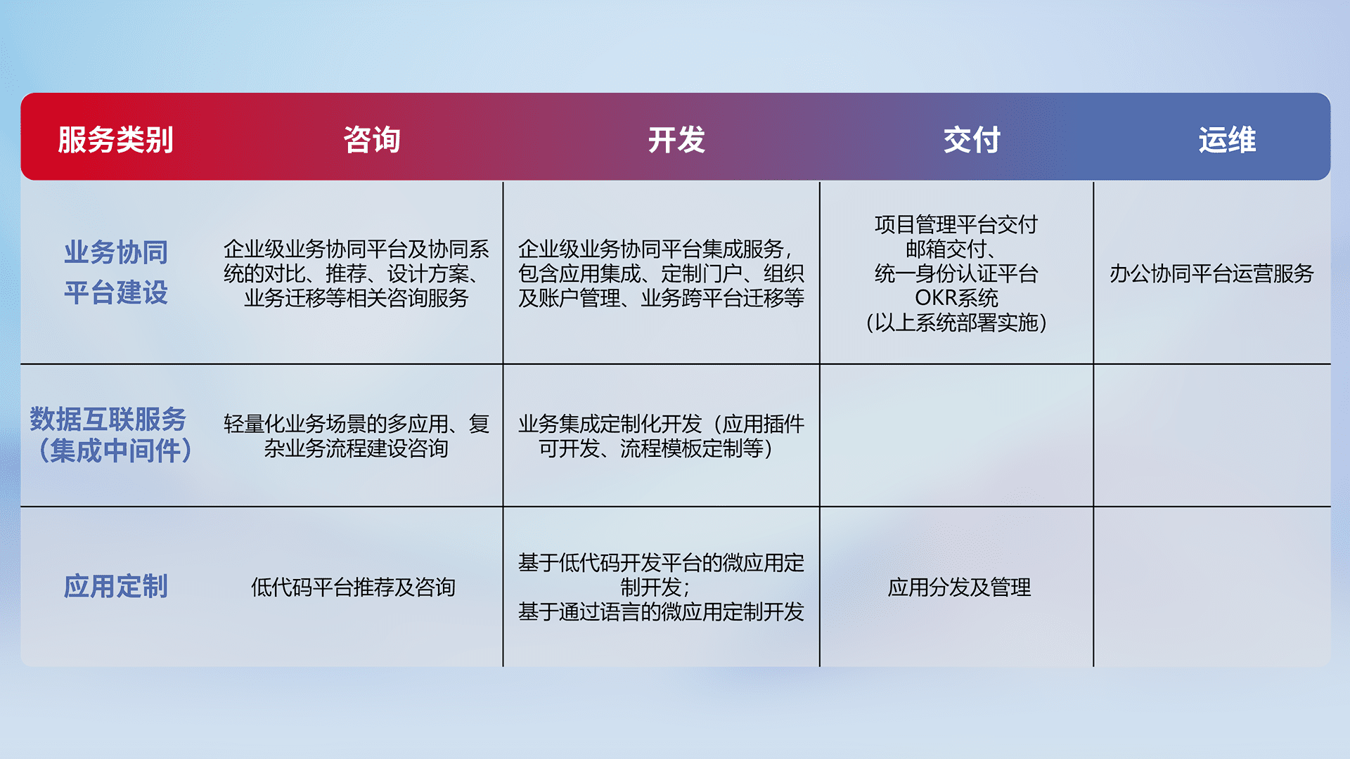 针对钉钉、、企微、、、IDaas等平台级产品提供产品的规划、、、方案、、交付、、、定制化开发等服务,,,,实现如统一协同办公、、智能客户服务、、、、混合会议管理、、智能数据查询、、、等业务场景,,,实现数字化转型。。。。