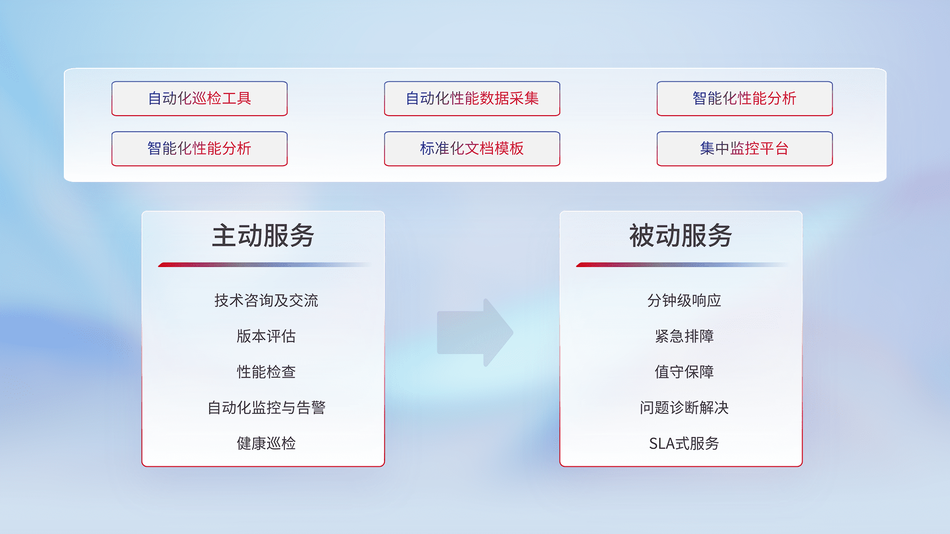 智能化工具和标准化文档,,保障服务质量,,,,提供主动服务(包含技术咨询、、、、版本评估、、、、性能检查、、、自动化监控与告警、、健康巡检)和被动服务包含(分钟级响应、、紧急排障、、值守保障、、、问题诊断解决、、、SLA服务)。。