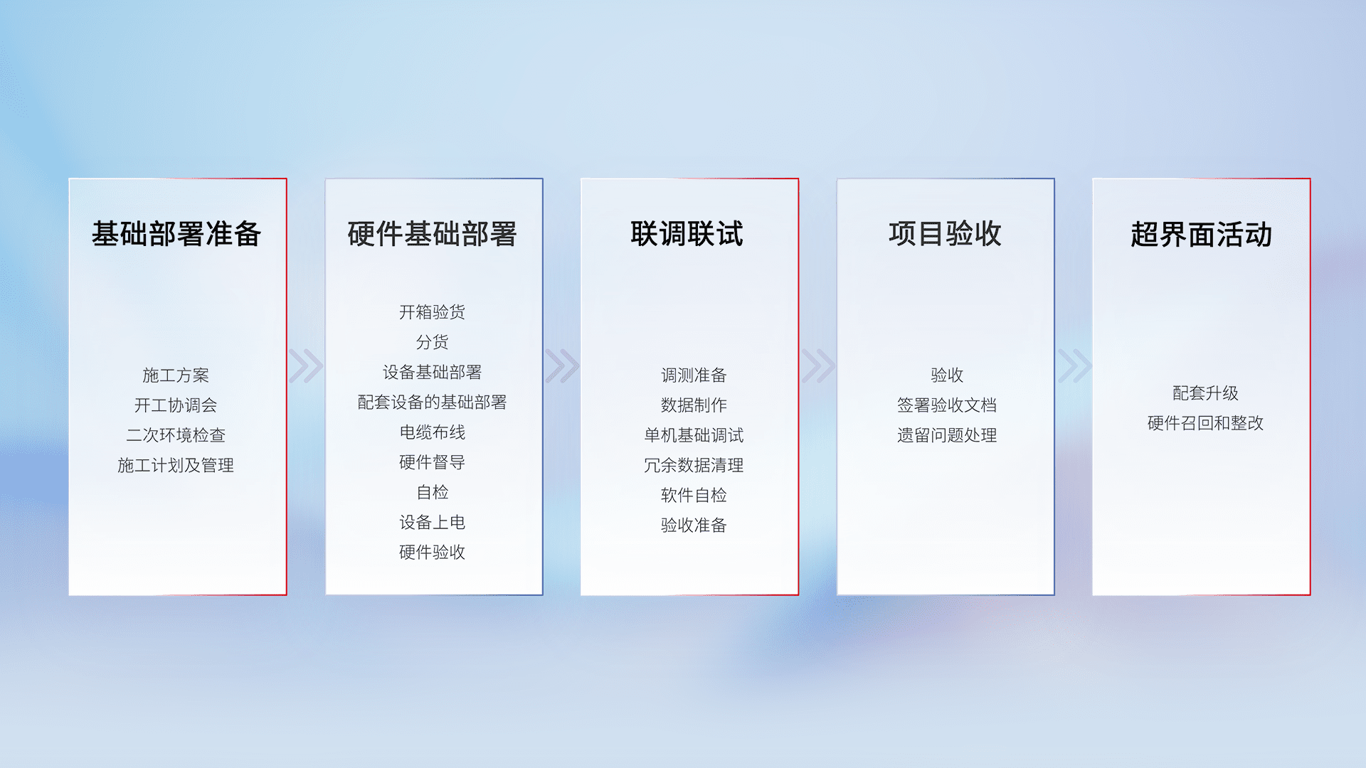 从基础部署准备、、、硬件基础部署、、、、联调联试、、、项目验收、、、、越界面活动的全过程可追溯,,,,保证施工质量和进度。。。